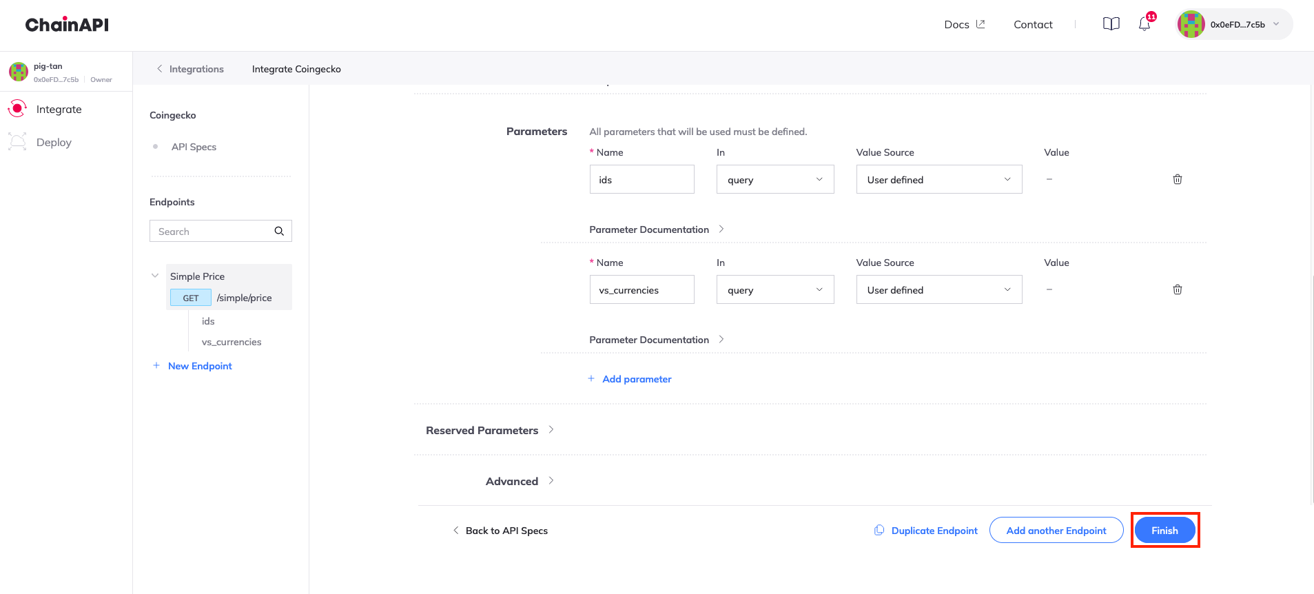 Reserved parameters define what part of the response is to be picked and encoded before fulfillment. It can be defined by the requester or can also be hardcoded in the Airnode configuration. To hardcode the reserved parameters, click on Reserved Parameters to define the parameter's _name, _path and _times.