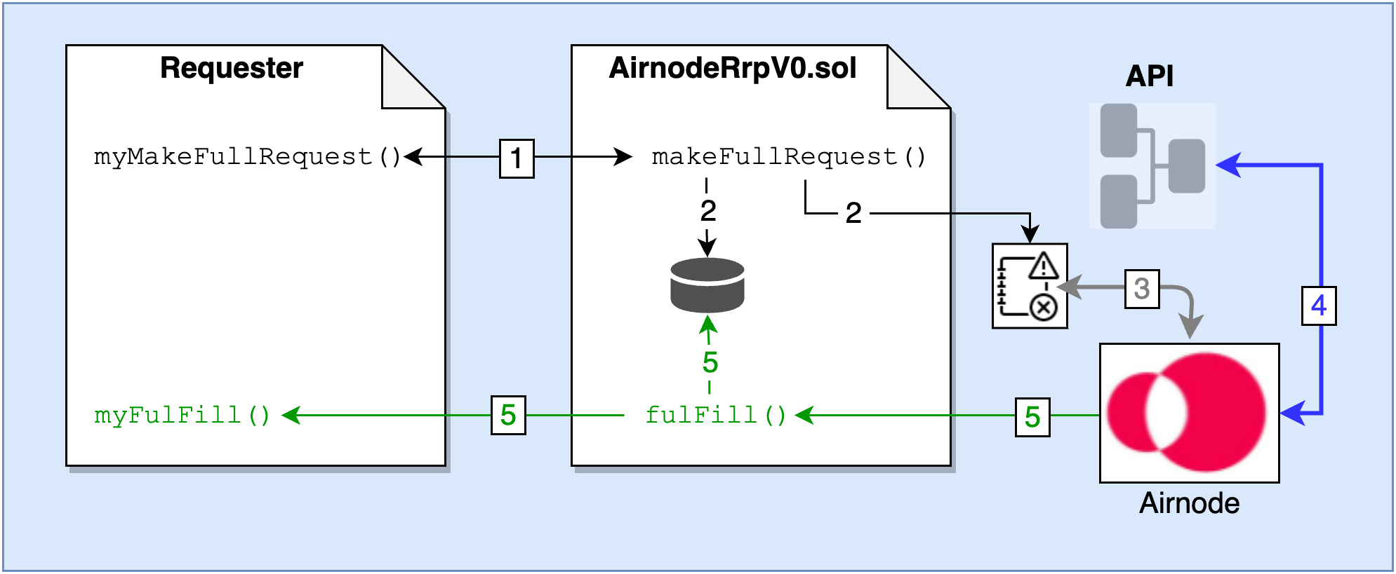 A request is made, by a requester, to either the makeFullRequest() or makeTemplateRequest() functions of the AirnodeRrpV0.sol protocol contract which adds the request to its storage. The targeted off-chain Airnode gathers the request from AirnodeRrpV0.sol's storage and responds using the fulFill() function of AirnodeRrpV0.sol.