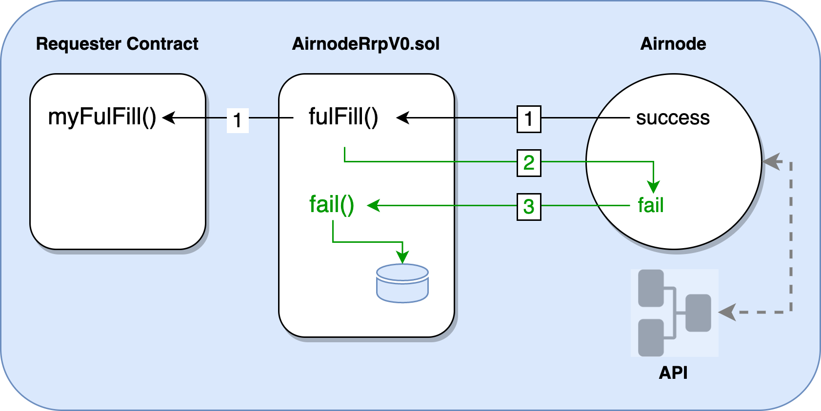 As noted in the diagram above, if the transaction that calls fulfill() returns false, the Airnode decodes the revert string and calls the fail() method to report the failure. For privacy and security reasons, API error messages are not sent on-chain. Also note that the node will not attempt to fulfill a failed request afterwards.